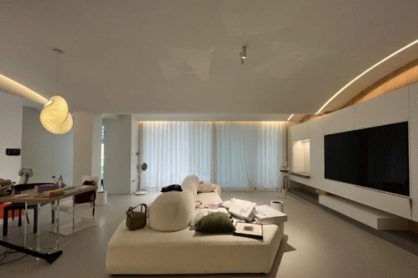 業主家是簡約化裝修,都以簡為美,流線弧形燈帶設計,簡約而不簡單,柔和的曲線 吸引眼球,為幾何美學鋪就視覺過渡,空間的情調無以復加.